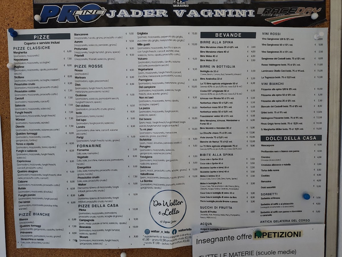 The menu at Walter and Lella in Murata, San Marino, offers a delightful array of traditional and unique pizzas, providing something for every palate. The Pizze classiche section features timeless options like the Carciofi, topped with artichokes, the classic Margherita, and the flavorful NapoletanaPugliese and Siciliana. For those craving a twist on the traditional, the Pizze bianche range offers creamy and rich choices like the Bianca, Quattro formaggi, and the fresh PrimaveraStracchino e rucola, all sure to satisfy cheese lovers and vegetarians alike. The Biancaneve is another creamy delight that adds a unique touch to this category.